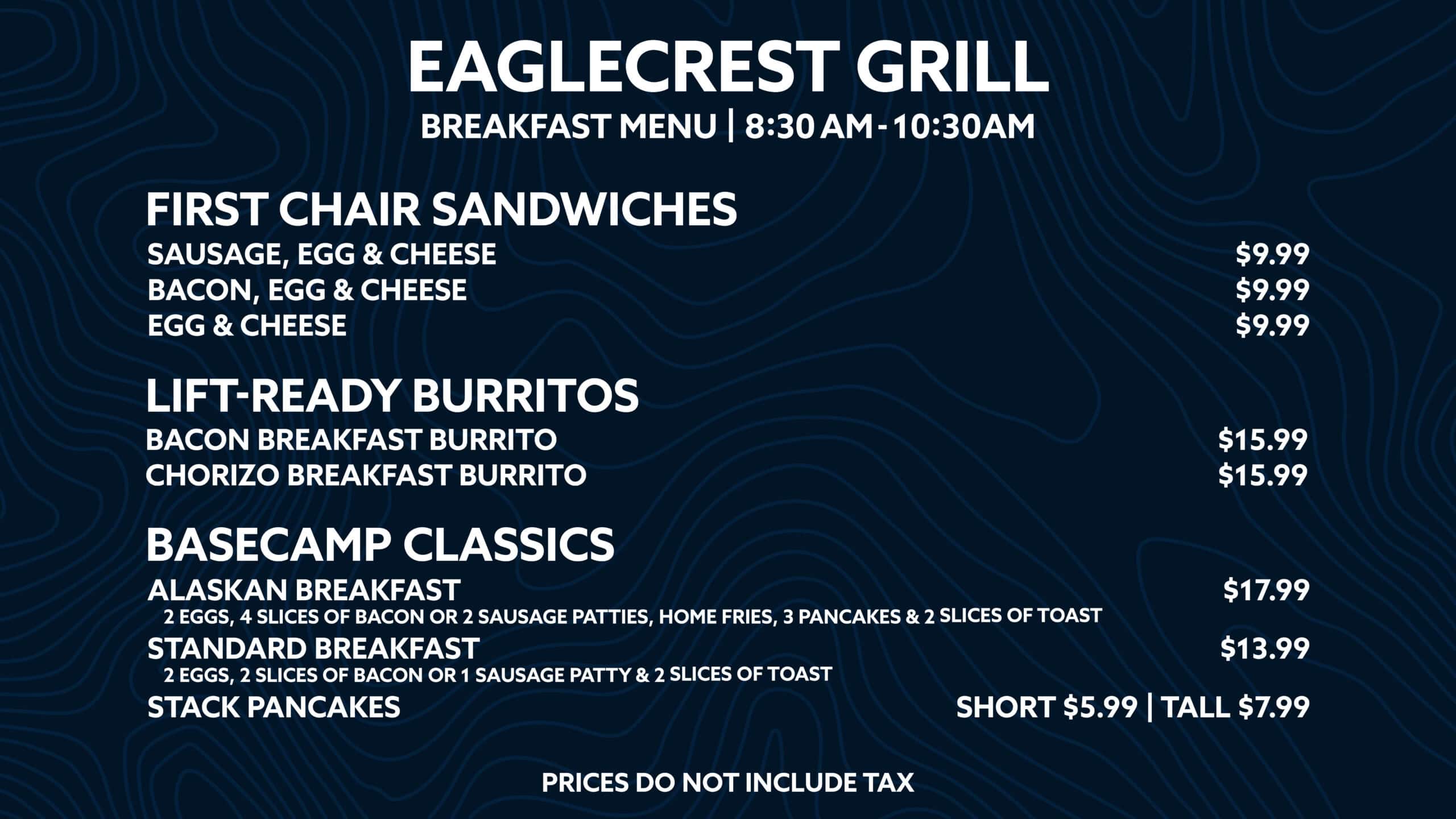 The Eaglecrest Grill will be open each operating day with dine-in and to-go options for picking up food. We are back to normal operations in the upper Fish Creek Lodge where you can order, grab and go and pay all at the Grill. Breakfast is served from 8:30 AM until 10:30 AM, Lunch is served from 10:30 AM until 3 PM.
